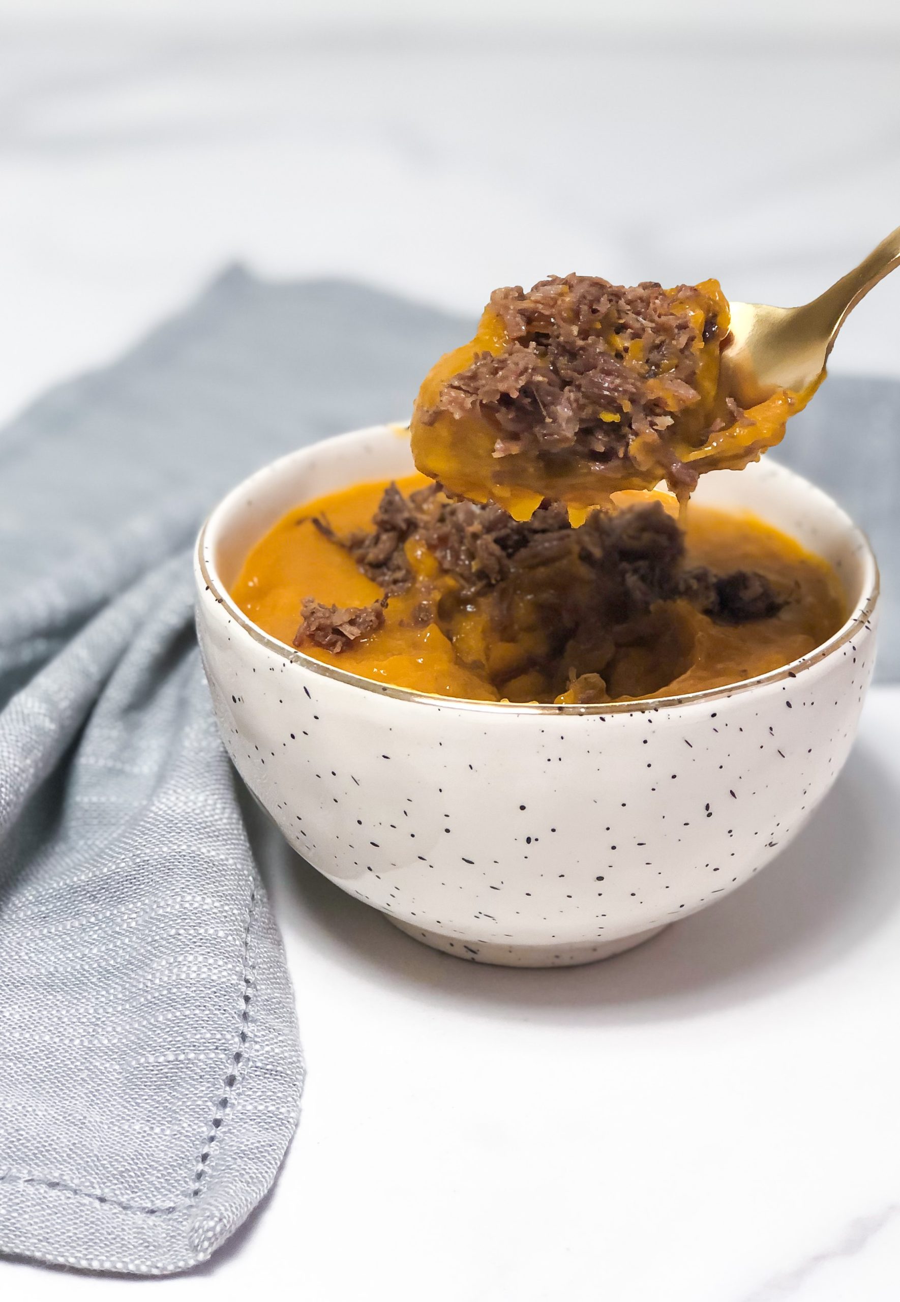 Creme de aipim, moranga e carne desfiada