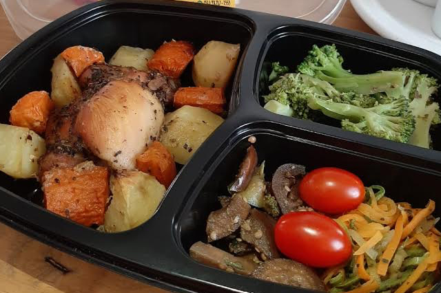 Seja o primeiro a avaliar “Sobrecoxa marinada com batatas e cenouras assadas, legumes.”