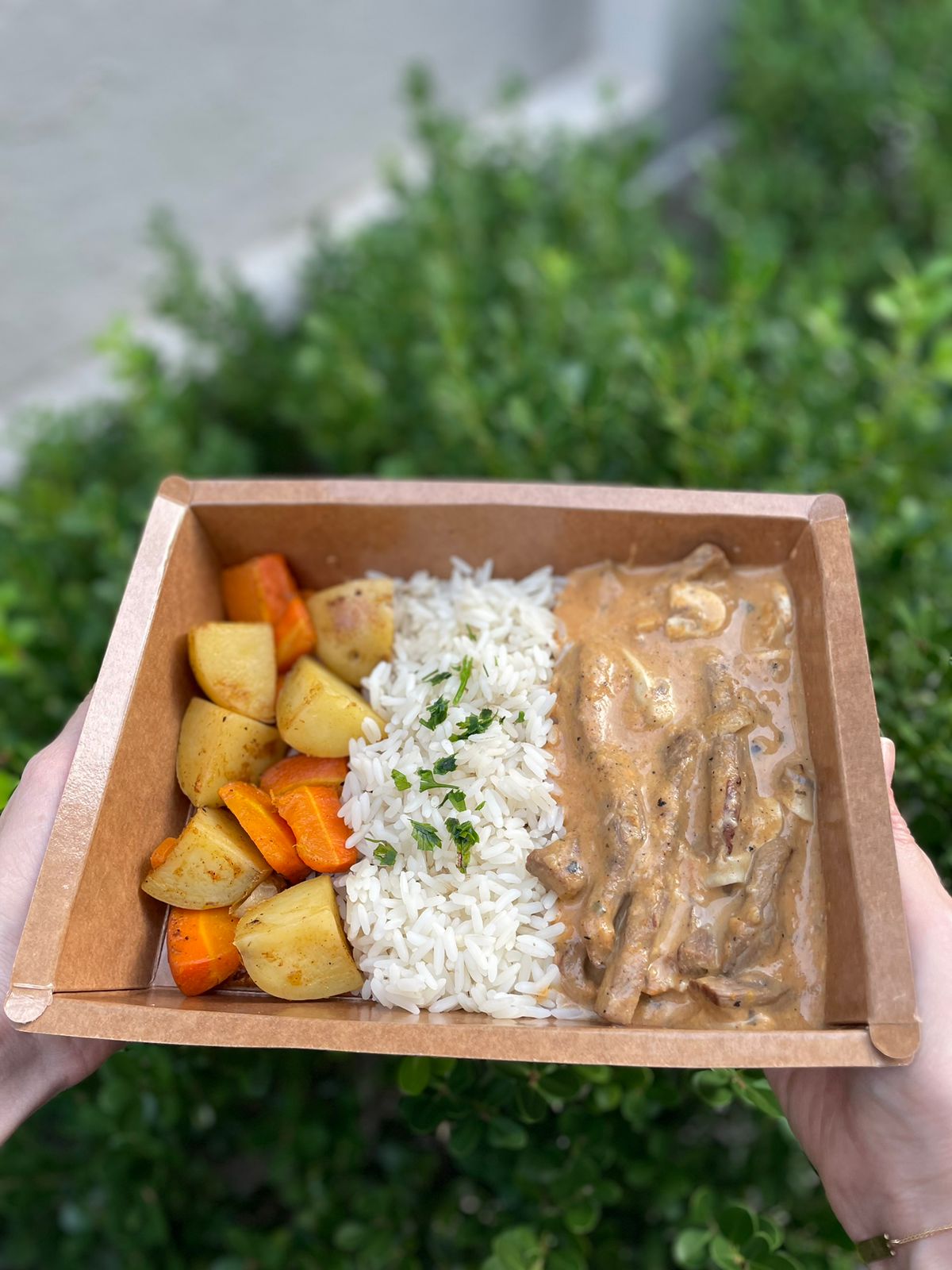 Strogonoff de carne, arroz branco, batata e cenoura rústica