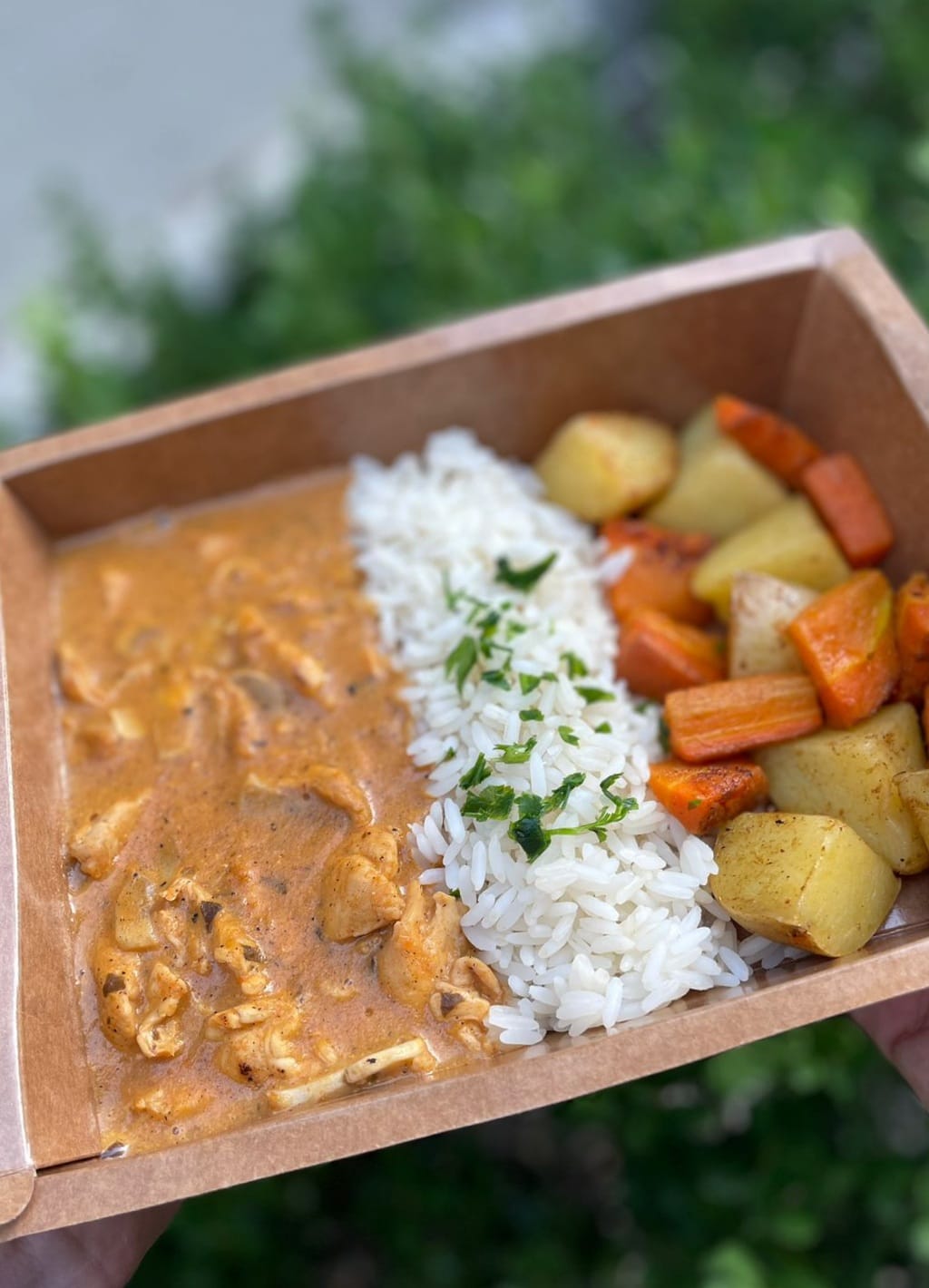 Strogonoff de frango, arroz branco, batata e cenoura rústica