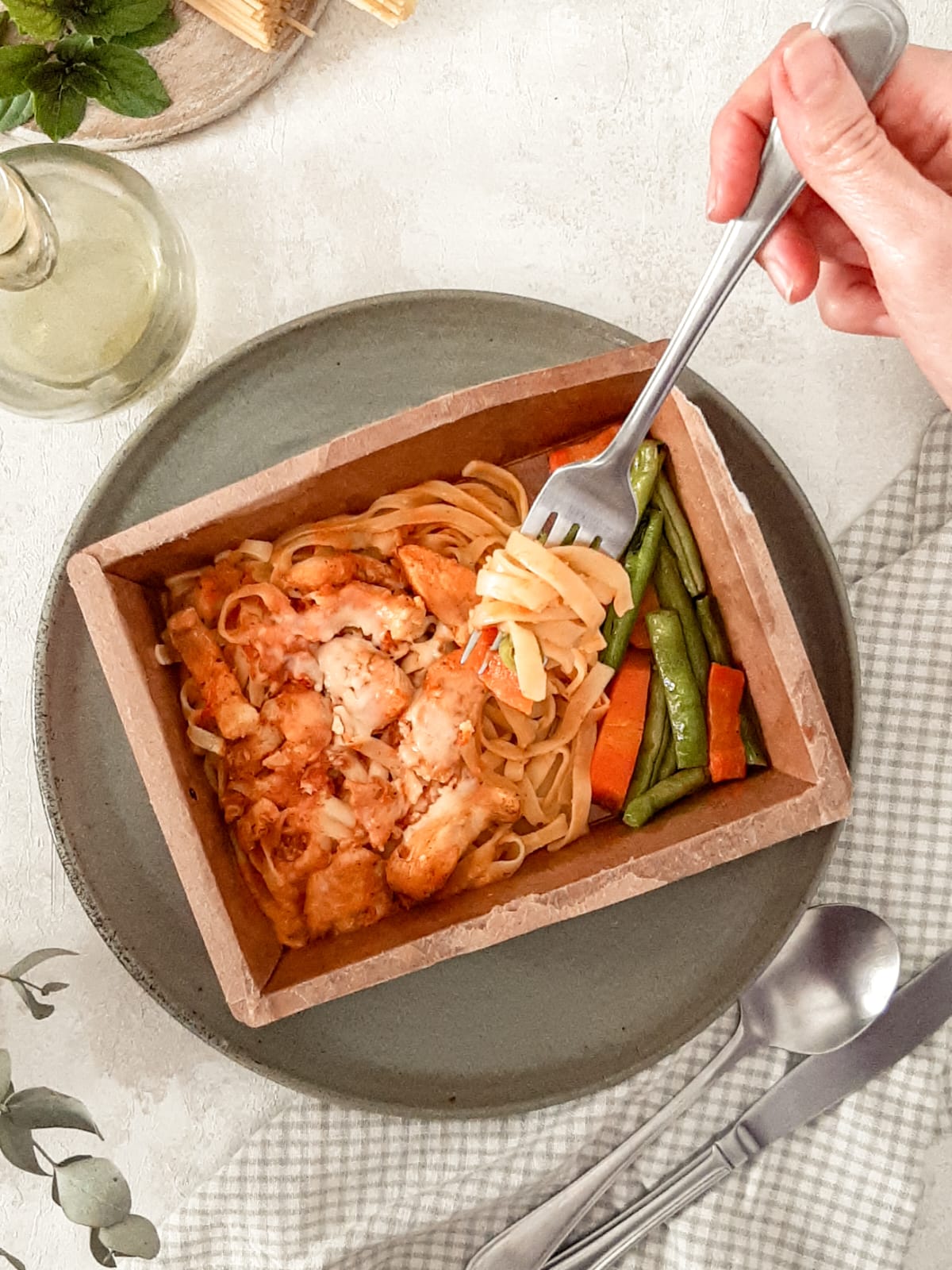 Talharim e iscas de frango ao molho pomodoro, queijo parmesão ralado, vagem e cenoura salteados.